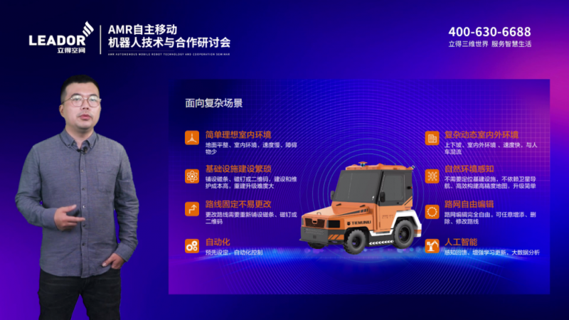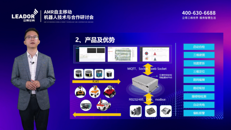 立得空間智能機器事業(yè)部銷售總經(jīng)理黃維分享了立得空間在AMR自主移動機器人領(lǐng)域的合作案例。他指出,立得空間利用核心技術(shù)和產(chǎn)品已為數(shù)千家底盤廠家賦能。其中,核心產(chǎn)品“路霸”機器人行進系統(tǒng)(PNS)采用3Dslam技術(shù)路線,經(jīng)過五年的迭代更新,適應(yīng)各種復(fù)雜場景,在室內(nèi)外、上下坡、高速和人車混流等場景實現(xiàn)定位導(dǎo)航,滿足不同場景下的柔性導(dǎo)航需求。
