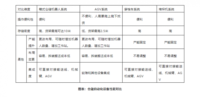 在3PL及電商倉儲(chǔ)中,當(dāng)前主要有4類自動(dòng)化解決方案,箱式倉儲(chǔ)機(jī)器人/AGV系統(tǒng)/穿梭車系統(tǒng)/堆垛機(jī)系統(tǒng),四類方案各有其優(yōu)劣勢(shì)。